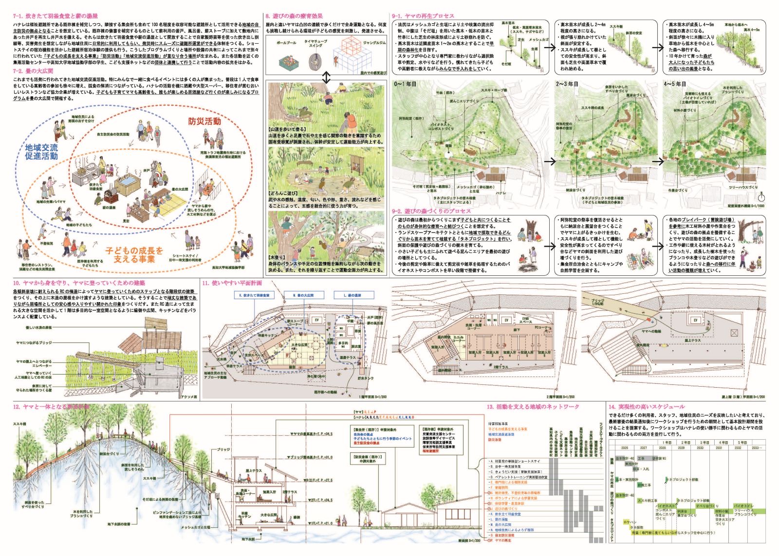 「みんなのハナレ」はヤマの崖の擁壁に沿って計画された建築で、ヤマへのアクセスとして機能する。前面の通りに対して開かれた1階の広間とキッチン及び湯屋は、道行く人たちを気軽に建物へと迎え入れる開かれた福祉施設である。施設の屋上テラスはブリッジを介してヤマへと繋がる。施設の活動として行われる「ヤマの再生」は土砂災害に対する自主防災活動であると同時に地域の景観・環境形成にも貢献する。