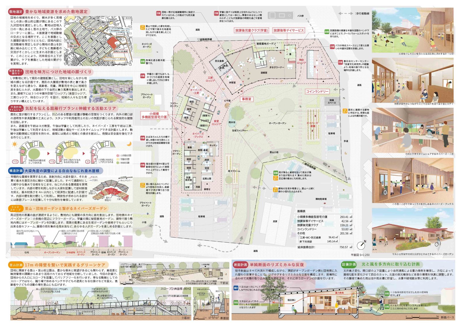 団地において高齢者と子どものための複合施設は、団地再生を果たしつつ団地を未来に繋げるためのモデルケースとなることが期待される。団地の入口に立地する木造平屋の本建築はユニークな屋根形状が特徴であり、団地の典型的なイメージとされる鉄筋コンクリートのボックス型住棟が連立する景色とは対照的で、シンボリックな存在となる。建築の設計と事業の方針とが融合した提案として評価された。